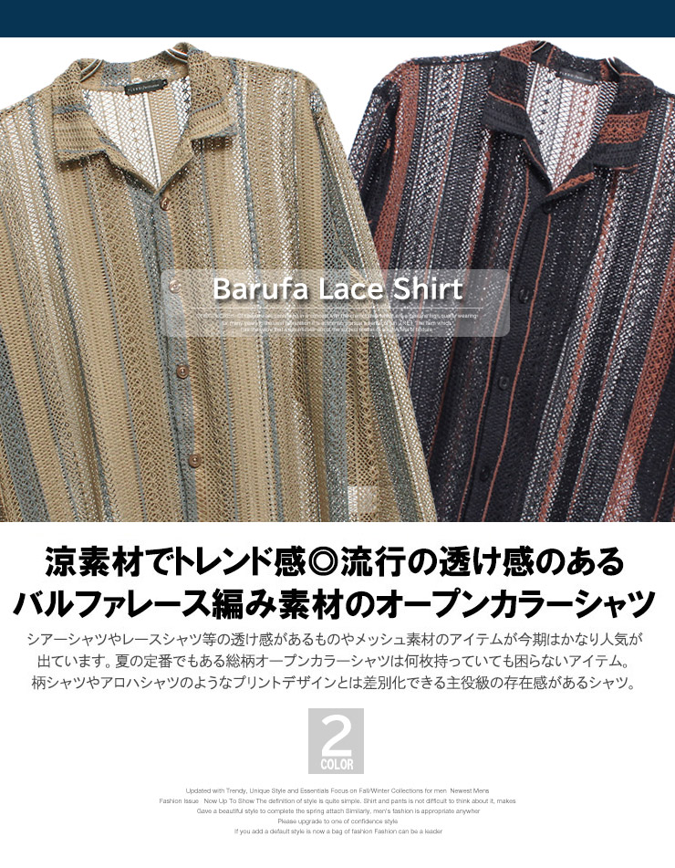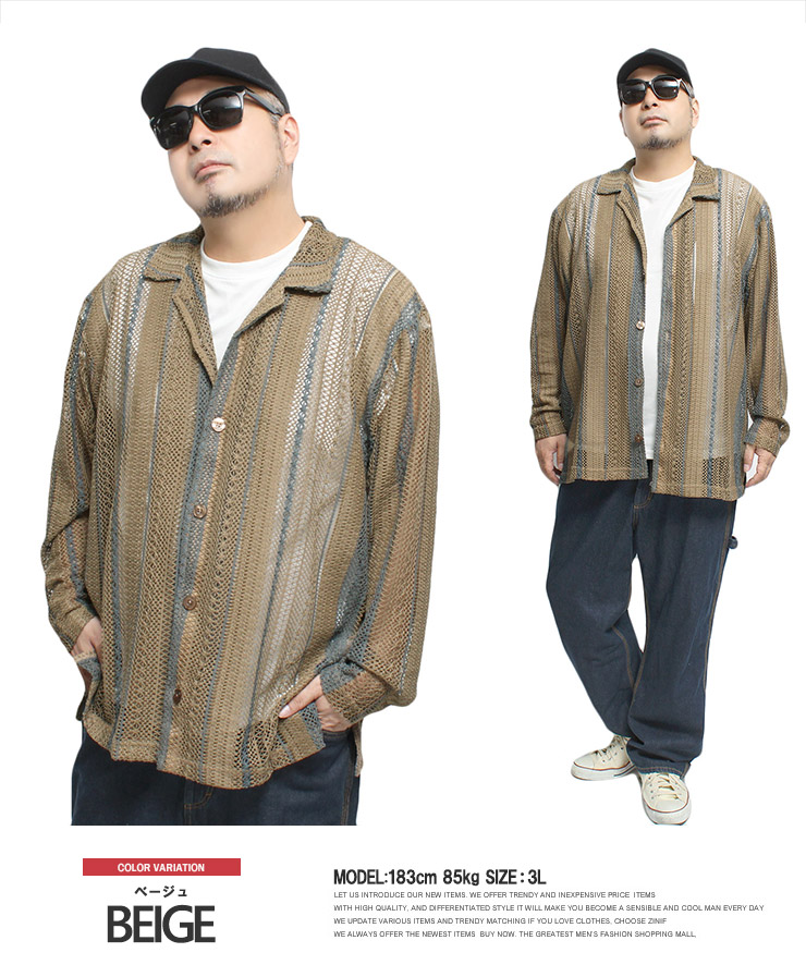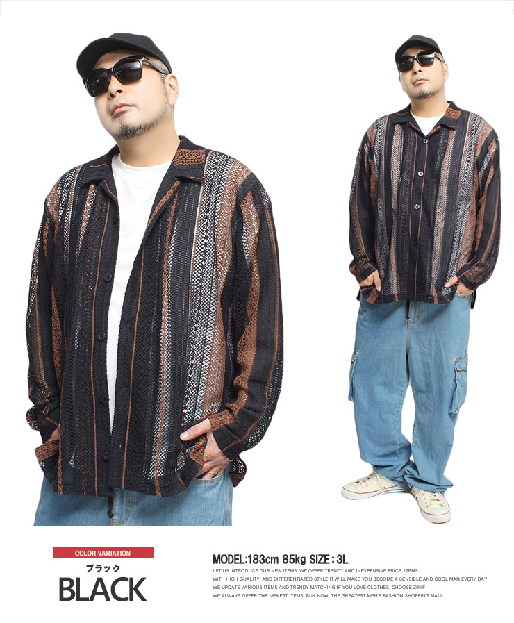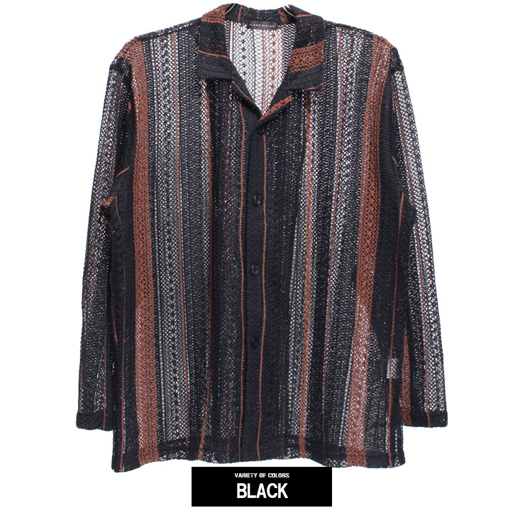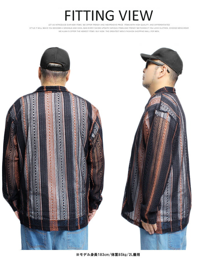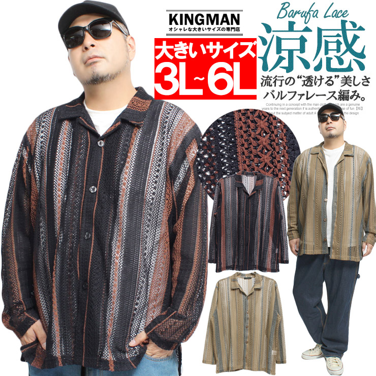 【最大6L】 大きいサイズメッシュ 長袖シャツ メンズ 透け感 総柄 バルファ レース ストライプ オープンカラーシャツ 薄手 トップス シアーシャツ メッシュシャツ ストライプシャツ ス〇