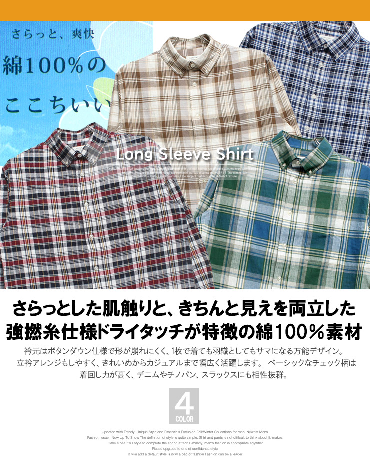 チェックシャツ チェック柄 シャツ 長袖シャツ 長袖 ボタンダウン BD 立衿 スタンドカラー たてえり 強撚糸 強撚 ドライタッチ さらさら 綿100 コットン100 天然素材 通気性 吸汗 春 秋 夏 羽織り ライトアウター レイヤード 重ね着 カジュアル きれいめ トラッド アメカジ ワーク 大人 メンズ 男性 紳士 40代 50代 60代 通勤 オフィス 休日 お出かけ 旅行 アウトドア キャンプ ゴルフ ワンマイル デニム相性 チノ相性 ネルシャツ フランネルシャツ オンブレ チェック レッド 赤 ネイビー 紺 ブルー 青 グリーン 緑 ベージュ 白 ブラック 黒 大きいサイズ 2L LL XL 3L XXL 4L XXXL 5L 4XL 5XL