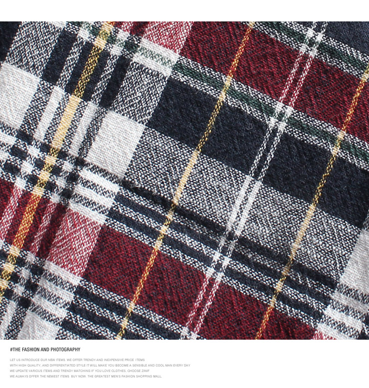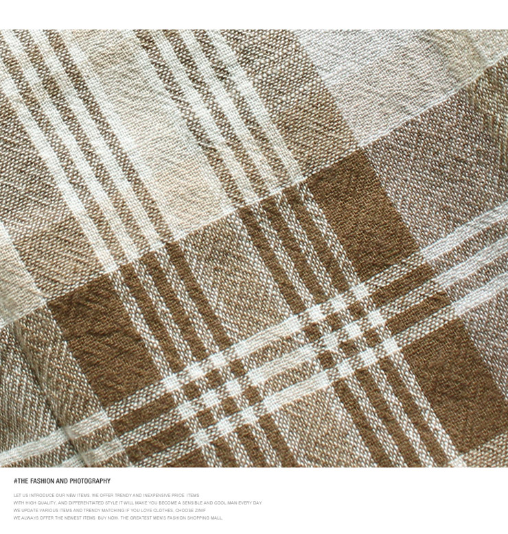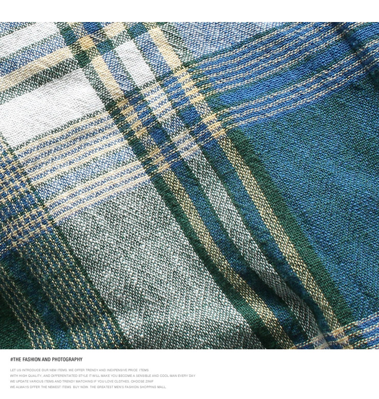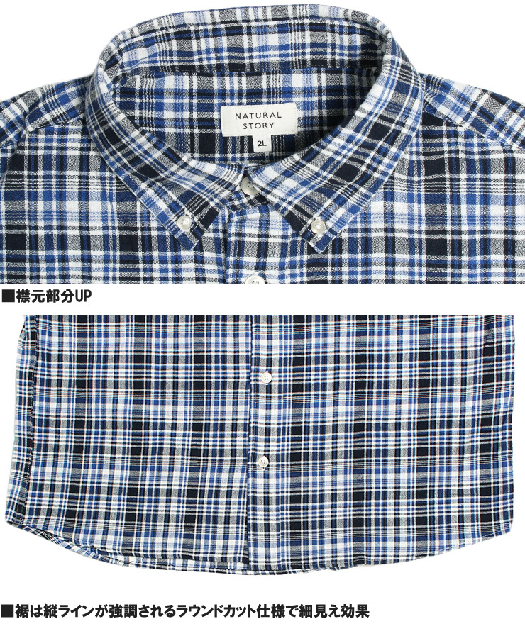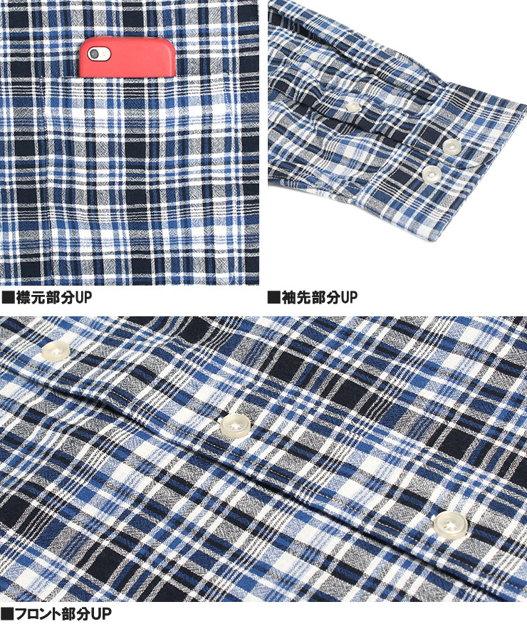仕様は強撚糸の綿100%チェック生地、ボタンダウン衿、長袖、立衿対応、ボタン開閉のシャツデザイン。