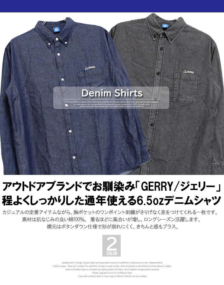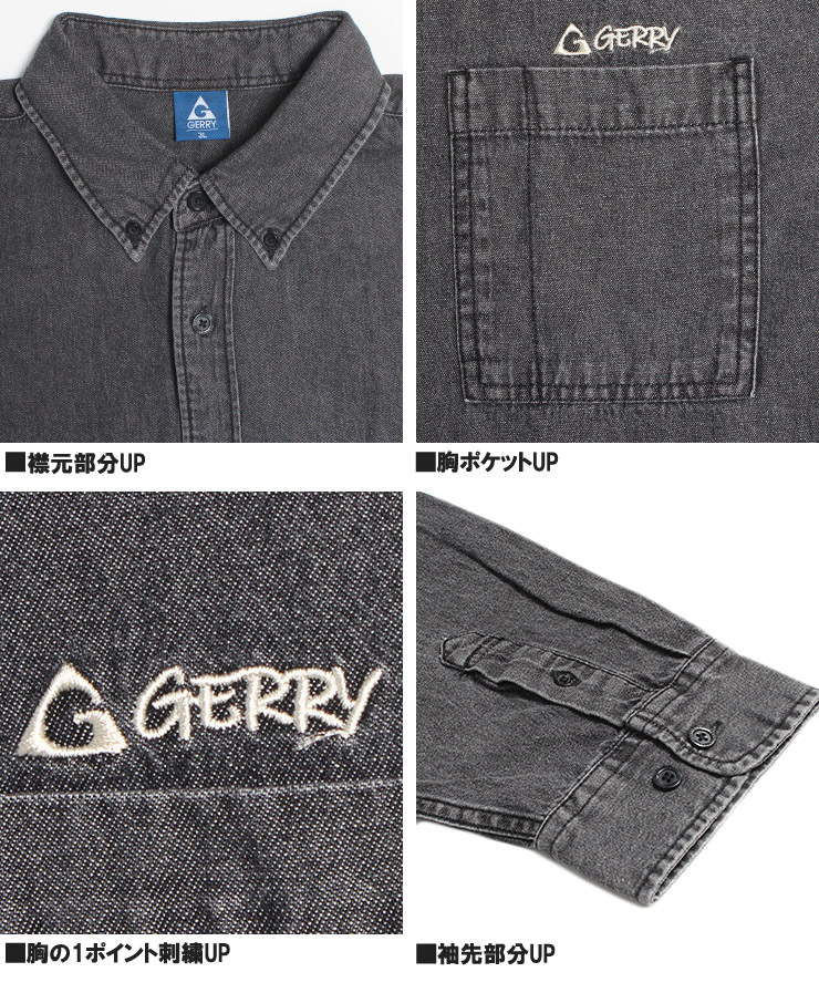GERRY ジェリー デニムシャツ デニム シャツ 長袖シャツ 長袖 BDシャツ ボタンダウンシャツ ボタンダウン BD襟 ボタン襟 襟付きシャツ 胸刺繍 刺繍 ワンポイント刺繍 ロゴ刺繍 胸ポケット ポケット付きシャツ コットン100 綿100 綿 コットン cotton 6.5oz 6 5oz デニム生地 ライトデニム インディゴデニム ブラックデニム ウォッシュデニム 羽織 羽織り シャツジャケット ライトアウター オーバーシャツ シャツアウター カジュアル アメカジ ワーク ワークシャツ ストリート 大人カジュアル シンプル ベーシック 定番 きれいめカジュアル キレカジ トレンド ルーズフィット ゆったり 大きめ ビッグシルエット ビッグ ビック オーバーサイズ 体型カバー 着回し 重ね着 レイヤード インナー Tシャツ合わせ 白T 黒T ロンT合わせ 春 夏 秋 冬 オールシーズン 春服 夏服 秋服 冬服 ロングシーズン デイリー 普段着 休日コーデ 旅行コーデ アウトドア キャンプ 釣り 散歩 公園 通勤 通学 ワンマイル ルームウェア ではない メンズ メンズファッション 男性 紳士 大人 30代 40代 50代 60代 パパコーデ ビジカジ オフィスカジュアル スマートカジュアル デニムトップス シャツトップス 前開き フルオープン ボタン開き ボタンシャツ 前立て しっかり生地 丈夫 タフ ヘビロテ ギフト プレゼント 誕生日 父の日 敬老の日 クリスマス 贈り物 人気 おすすめ トップス シャツ 襟シャツ 長そで 長袖 無地風 ベーシックカラー ネイビー 紺 ブラック 黒 インディゴ ブルー 青 ユーズド感 カジュアルシャツ シャツコーデ 大きいサイズ 2L LL XL 3L XXL 4L XXXL 5L 4XL 5XL
